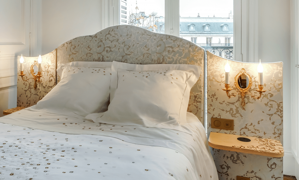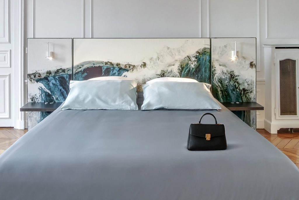 CHAMBRE EN SCÈNE revendique une approche artisanale, à contrario des process industriels fréquents dans ce secteur. Cette particularité l’amène à collaborer avec des artisans et des artistes qui partagent avec elle l’amour du beau, le goût du détail et celui de la finition parfaite. Les ateliers des menuisiers, tapissiers, gainiers d’art et plasticiens n’ont plus de secrets pour elle. Sa capacité à offrir du sur-mesure lui permet ainsi de déployer un véritable travail d’orfèvre et de proposer des produits faits main ultra-personnalisés.